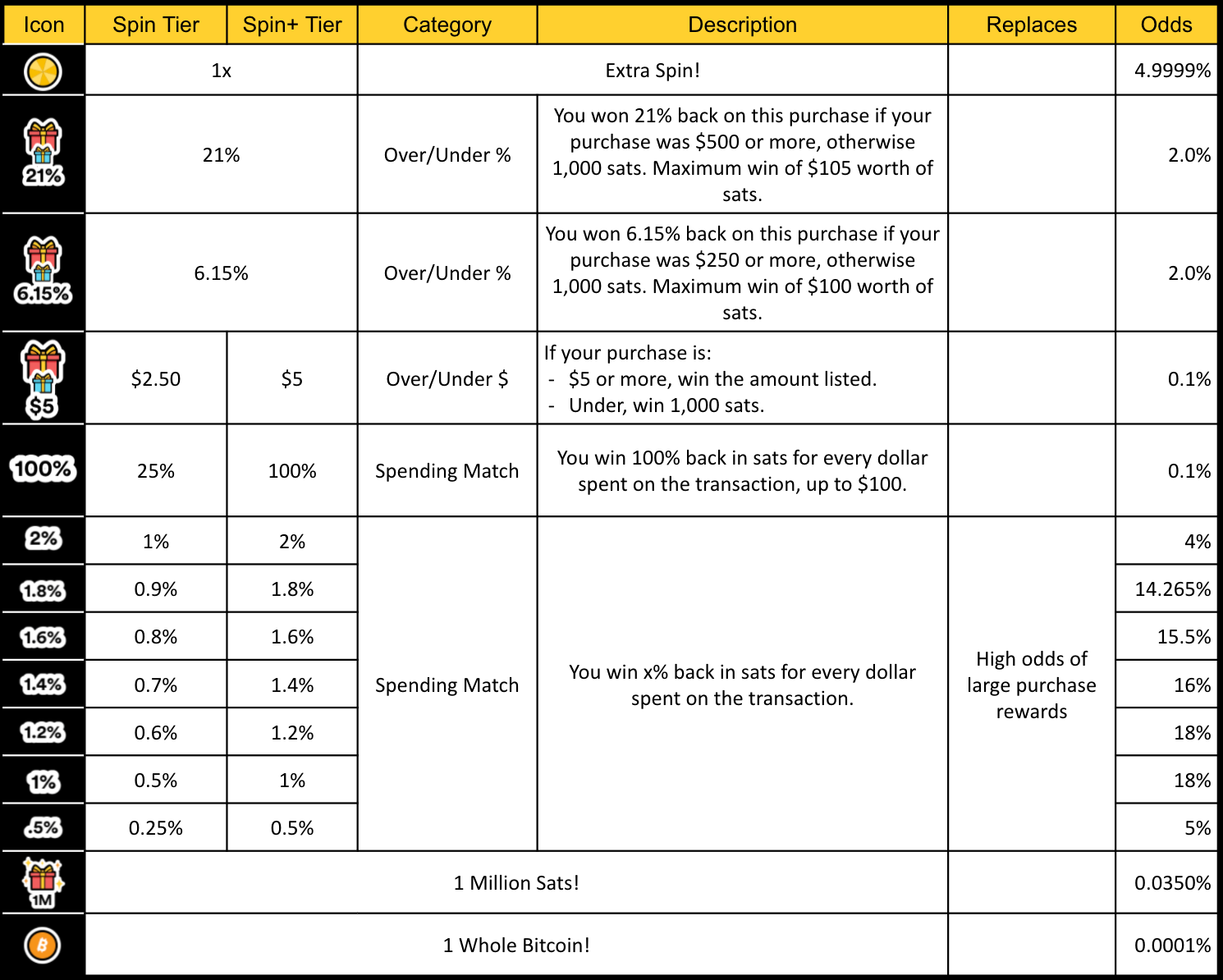 • Spiked odds of straight Spending Match prizes of 0.5%-2% back (~30% to 90%!)