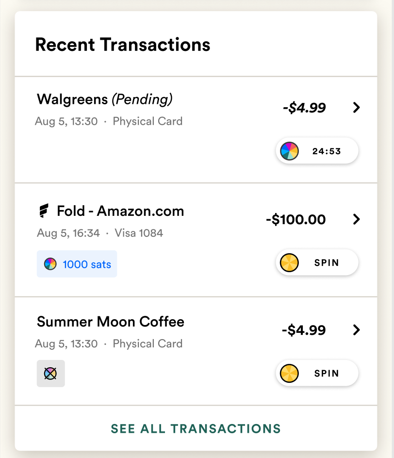 Soon, you’ll be able to use available extra spins to spin on a portion of your ACH purchases. This means you’ll be able to get sats back on transactions made using your Fold Card account and routing number — like rent, mortgage, and utility bills.