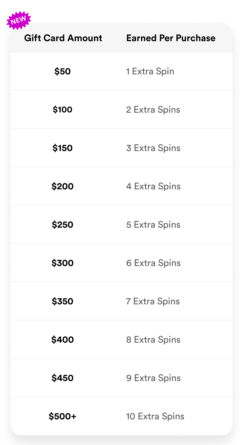 Earlier this week, we introduced a change to our Gift Card program. Instead of spinning for additional rewards on that Gift Card, we now reward you with 1 Extra Spin for each $50+ spent on that Gift Card.