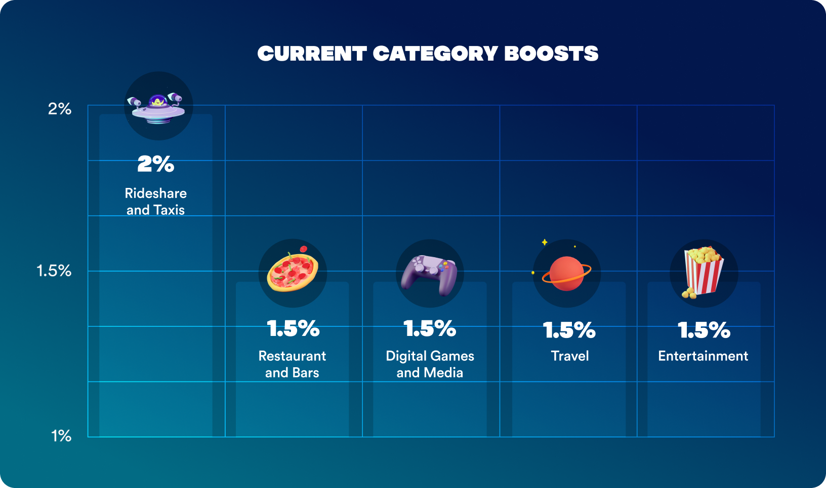 Simply put, Category Boosts are automatic increased rewards on certain spend categories for a certain period of time. These can be categories like Travel, Entertainment, Restaurants and Bars, Gas Stations, or Digital Games and Media… the places at which our cardholders like to shop the most. We will regularly rotate out which categories are boosted to keep things exciting and the rewards flowing.