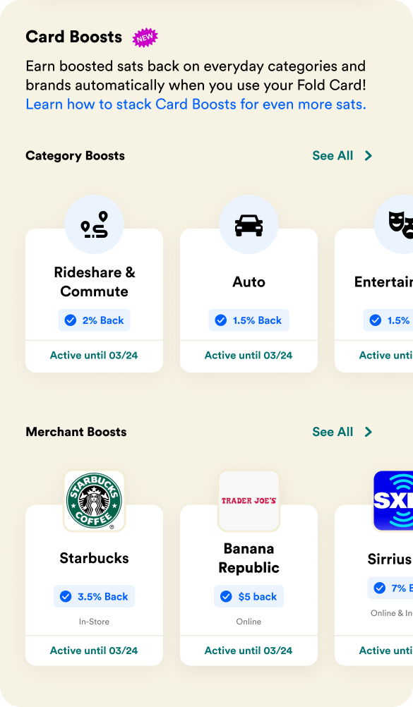 Exciting news Fold Cardholders! We're thrilled to introduce Category Boosts, the latest addition to our Spin+ exclusive Card Boosts feature, going live today on September 29, 2023. This new feature will supercharge your rewards automatically, giving you more ways to stack up to 2% back from your favorite stores when you pay with your Fold Card. Read on to see how you can maximize this new feature and increase your sat stacking potential.