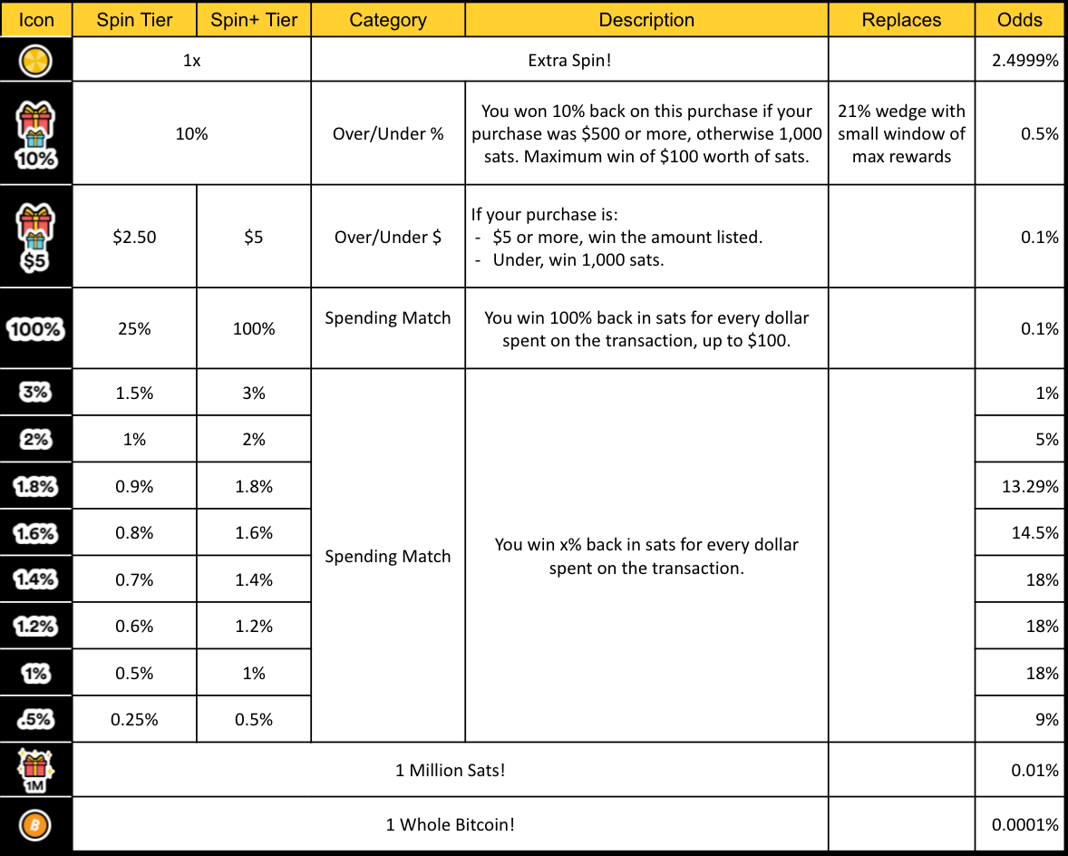 Coming up with this wheel was a no-brainer for us: keep what's working and ditch what doesn't. We are continuing to maintain solid rewards for transactions of all sizes while also keeping things interesting chances to win up to 10%, 100%, 1 Million, and 100 Million sats.