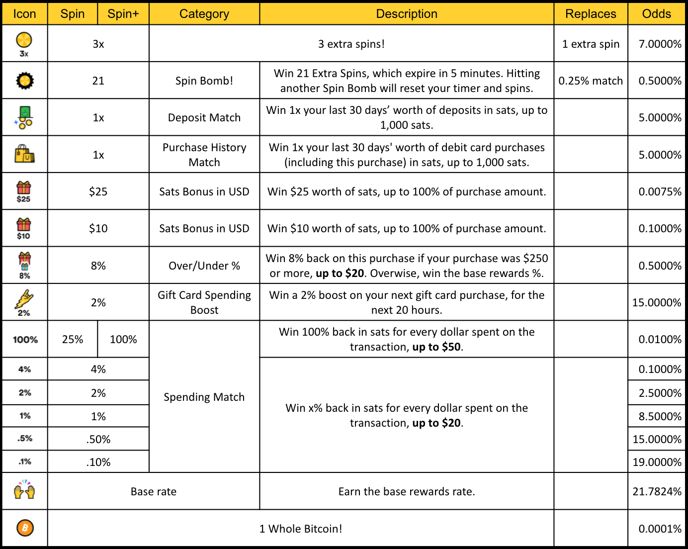 We've kept the base rate reward (1% for Spin+, 0.25% for Spin), plus we've added more fun ways to stack sats on top of the base reward rate, including the Spin Bomb!