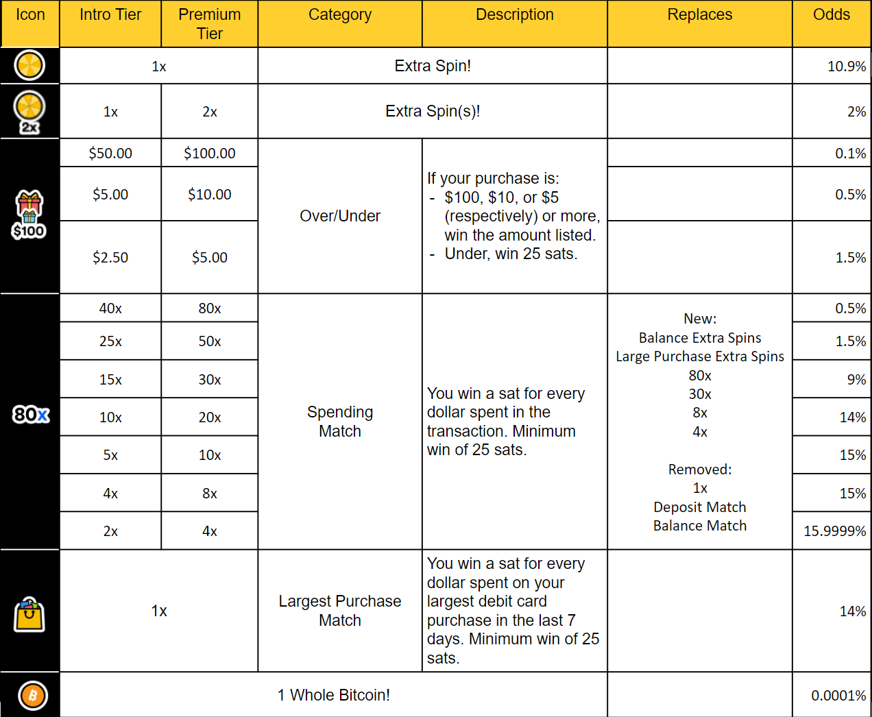 You like getting sats on purchases? Me too! The wheel now has an almost 71% chance that you will land on a reward that scales with the size of the purchase.